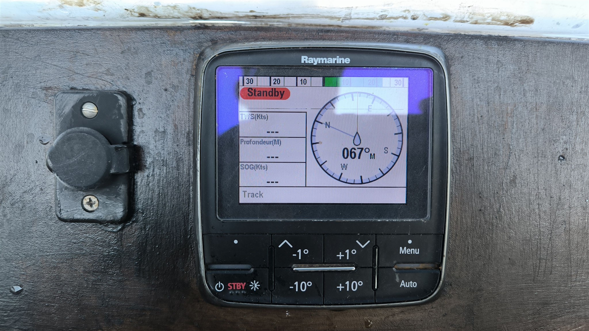 Compas, DSC VHF ( NAVICOM RT550), GPS (FURUNO GP), Lecteur de cartes (GARMIN GPS MAP 721), Loch, Pilote automatique (hydraulique, + calculateur remplacé ACU400 et pupitre P70), Sondeur.